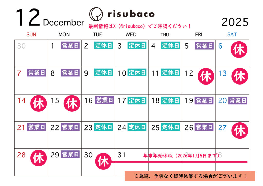 2025年12月も誠に勝手ながら、下記の通り変則営業させて頂きます。